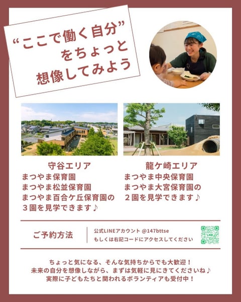 2025年11月 5日 見学会・説明会・試験日程 【新卒採用】2027年卒以降の学生の皆さん向けの見学会を行います! まつやま保育園グループでは、保育を学ぶ学生の皆さんが実際の現場にふれ、子どもたちと関わりながら学べる機会を設けています。 「保育の雰囲気を見てみたい」「子どもたちと関わる経験をしてみたい」そんな気持ちからの参加も大歓迎です。 見学から、子どもたちと関わるボランティアまで、目的に合わせた形での受け入れが可能です🌸 📩 見学・ボランティアをご希望の方は、お問い合わせフォームまたは公式LINEよりお気軽にご連絡ください。 ENTRY 公式LINE